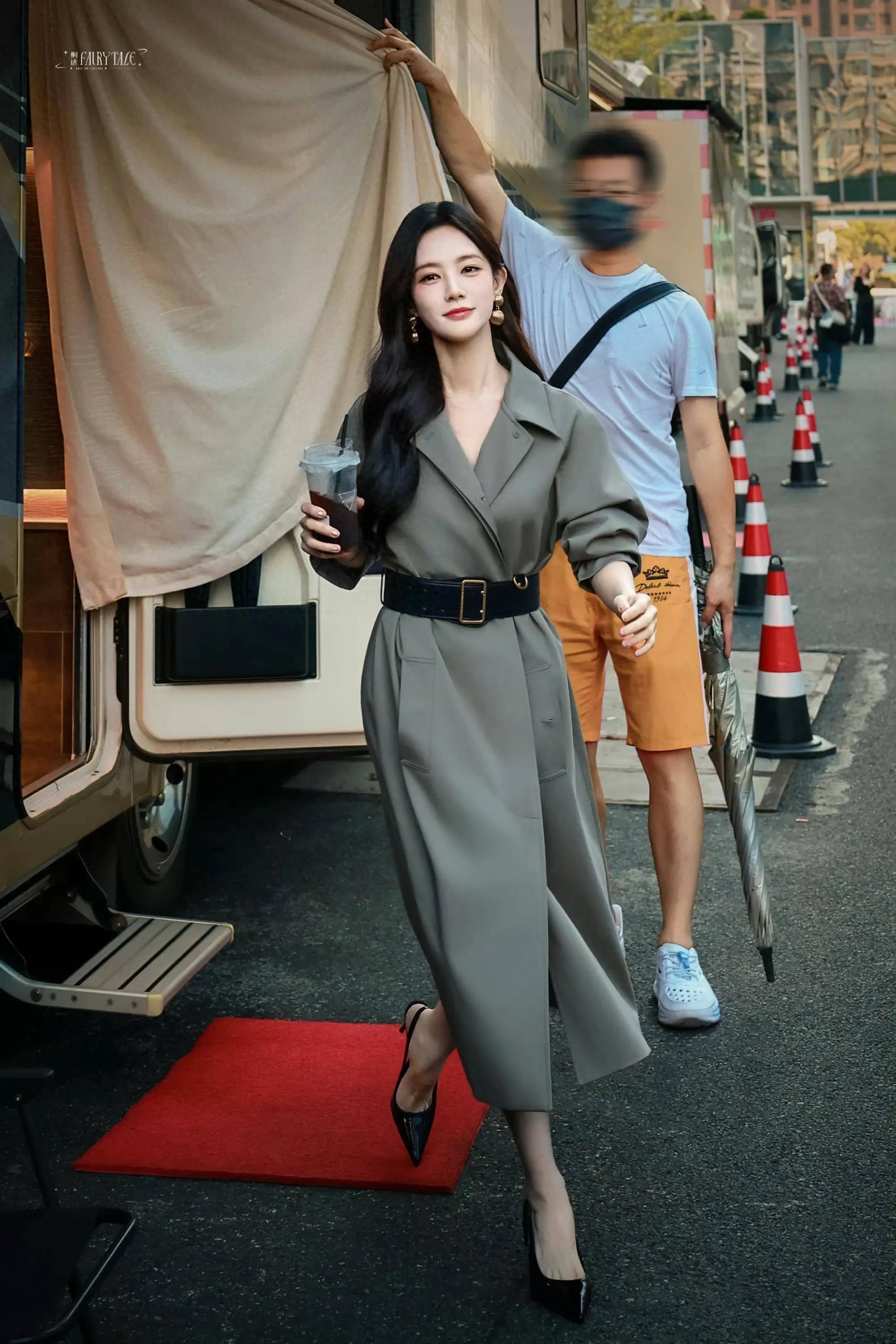 这套造型的精髓,在于“用细节打破风衣的沉闷感”。军绿色风衣自带飒爽气场,但李一桐没有让它沦为“中性单品”——首先用一条黑色腰带精准收腰,瞬间拉高腰线,让宽松的风衣勾勒出纤细腰肢,弱化了长款风衣的压身高问题;其次刻意保留“领口留白”,不堆砌项链等配饰,让视线自然聚焦于她精致的面部轮廓,为飒爽注入几分柔美。